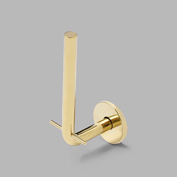 d line reservepapirholder - Børstet messing Den vertikalt ophængte reserve toiletrulleholder er velegnet såfremt man ønsker at have en ekstra rulle toiletpapir i nærheden som reserve. Qua sin skjulte befæstelse hænger den neutralt og funktionelt på badeværelsets væg. Den er håndforarbejdet og designet i 1973 af Knud Holscher, hvilket gør at den komplimenterer de øvrige ikoniske produkter i Knud Holscher Collection. Reserve toiletrulleholderen er fremstillet af 50-70% genanvendt rustfrit stål med en PVD overfladebehandling, som giver den en højglans poleret messing finish. Denne yderst holdbare, behandlede overflade vil ikke patinere over tid, men derimod bevare sin glans og udtryk mange år frem. Reserve toiletrulleholderen er af høj kvalitet, vedligeholdelsesfri og har en garanti på 20 år. Produktet er let at montere og skruer medfølger. Tekniske specifikationer: