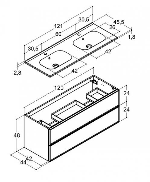 Denne elegante møbelpakke er lige sagen til det store badeværelse, hvor der også er stort behov for plads omkring håndvasken og god plads til opbevaring. Du får her et møbel med to rummelige skuffer, som begge kan trækkes ud i fuld dybde. De har begge selvindtræk og soft close, og kommer med skridsikre gummimåtter til at ligge i bunden. Den dobbelte håndvask giver ikke kun mulighed for at flere kan bruge håndvaskene til forskellige ting samtidig, den giver også god afsætningsplads rundt om og et stilfuldt finish til det flotte møbel. Du kan købe denne møbelpakke, som den er, men ønsker du at lave ændringer til størrelse eller sammensætning, så kontakt endelig vores gratis indretningsservice. Ønsker du ekstra tilbehør som ses på billedet, se da relaterede varer. Specifikationer: