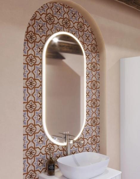 Dansani Hoop spejl m/lys og lysstyring 109 x 54 - Sort ramme Det ovale Hoop spejl giver et stilfuldt og moderne udtryk med sin unikke, svævende ramme. Den svungne inderramme leder lyset jævnt fremad og skaber et blødt, diffust lys, der giver en behagelig belysning uden at blænde. Spejlet er udstyret med lysstyring, så du nemt kan tilpasse lysstyrken til dit behov, hvad enten det er til makeup eller en afslappende stemning. Hoop spejlet fås som standard med en sort ramme, men det kan også fås i en speciallakeret farve, der passer til dit badeværelse. Til spejlet kan du tilkøbe et formonteret varmelegeme, så du undgår at spejlet dugger, når du er i bad. Specifikationer: