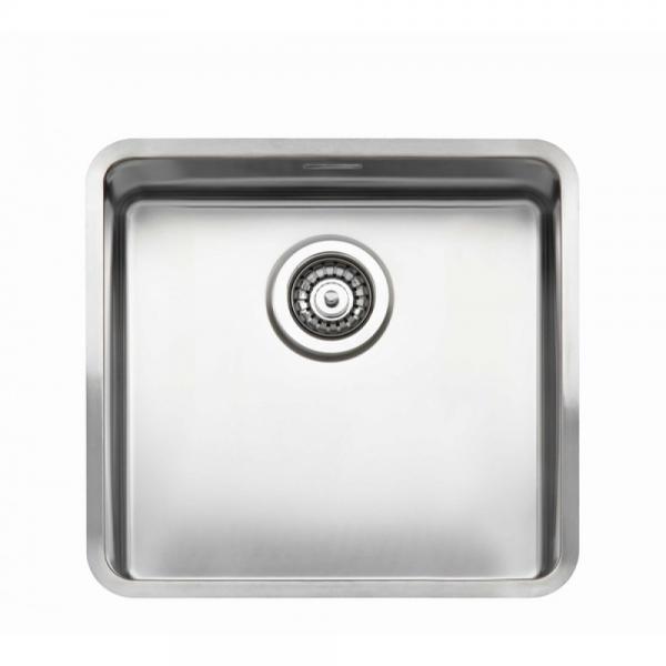 Rustfri stålvask, uden hanehul, i moderne design. De indvendige runde hjørner følger vaskens yderkant, hvilket giver et harmonisk design, ligeledes er de indvendige runde hjørner rengøringsvenlige. (R: bund: 15 og hjørner: 25 mm).