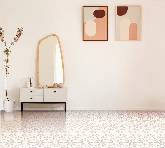 D-C Fix selvklæbende gulv - Vintage flowers Med de selvklæbende gulvplader i Vintage flowers kan et rum forvandles på ingen tid, og det har aldrig været nemmere at skabe et nyt udtryk i rummet. Den moderne gulvbelægning findes i en række minimalistiske og moderne designs, der alle gør det muligt at skabe den helt rigtige atmosfære. D-C-Fix selvklæbende gulvplader gør det nemmere end aldrig før at lægge et nyt gulv. Pakken indeholder 11 gulvplader, der hver måler 30,5 x 30,5 cm. Takket være den tilpassede form og den selvklæbende bagside kan gulvet lægges nemt og hurtigt. Én pakke dækker 1,02 m2 gulvareal. Inden gulvet lægges, skal fliserne akklimatiseres ved stuetemperatur i 48 timer før montering. Fundamentet skal være fladt, jævnt og fri for snavs, når gulvpladerne skal lægges. På pladernes bagside illustrerer en pil, hvilken retning pladerne skal monteres. Bagsidens papir fjernes og de selvklæbende plader presses i gulvet. For det bedste resultat trykkes der på hele overfladen, og der arbejdes fra midten og ud mod kanterne. Når gulvet er lagt, aftørres det med en fugtig klud og mildt rengøringsmiddel.