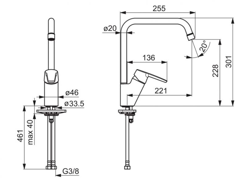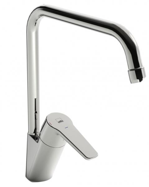 Køkkenarmatur med Eco-kartouche og koldstart. Høj svingtud. Eco flow op til 9l/min. Tudens svingradius er forindstillet til 120° (kan begrænses til 0°/60°). Indbygget begrænsning af temperatur og vandmængde. F = fleksible tilslutningsslanger |