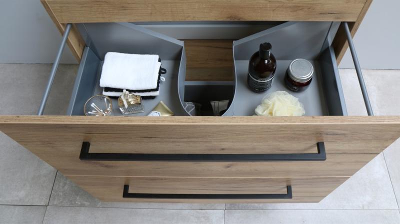 Sanibell Basicline møbelsæt 80 m/greb - Whiskey eg Med et Sanibell Basicline badmøbel får du en solid kvalitet. Møblet består af spånplade med melamin som giver en flot og rustik overflade med struktur. Der er abs kantbånd på alle kanter, så møblet er modstandsdygtigt over for den høje luftfugtighed på badeværelset. Møblet har 2 rummelige skuffer med praktiske høje metalsider, øverste skuffe er med udskæring til vandlås for optimal indretning. Begge skuffer er med softclose og kører på metalskinner af god kvalitet der har fuldt udtræk. Skufferne er med greb i krom (sort kan tilkøbes, se relaterede varer). Flot langt greb så skufferne nemt kan åbnes.