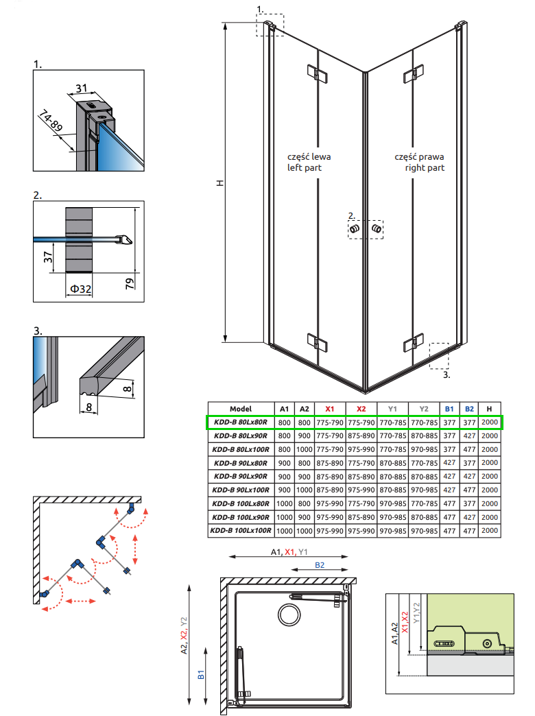 Strømberg Noma 110 bruseniche m/foldedøre - 80x80 cm - Klar glas/børstet kobber