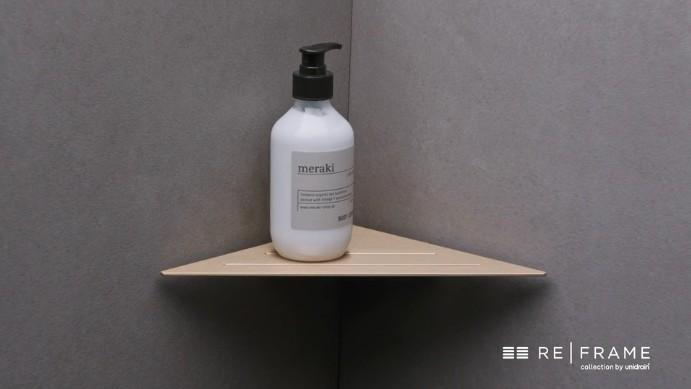 Unidrain ReFrame hjørnehylde - Sort Sæbehylde i forstærket stålplade for øget stabilitet. Tynde riller, sørger for at lede vandet væk og en anti-slip barriere holder tingene på plads, når hylden er våd. Smart ophængsløsning gør, at hylden kan tilpasses hjørner som ikke er præcis 90°. Pakken indeholder beslag, skruer og unbraco nøgle til montering.