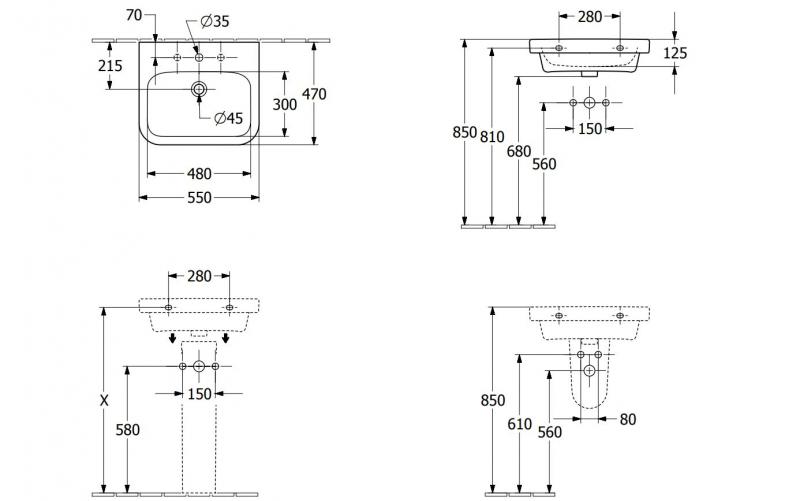 V&B Architectura 55 håndvask t/væg - 1/3 hanehuller