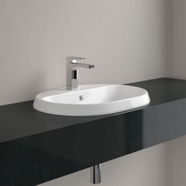 V&B Architectura 60 håndvask t/nedfældning - 1/3 hanehuller Oval nedfældningsvask fra Villeroy & Boch Loop & Friends. Denne håndvask har, foruden sin charmerende ovale form, en platform, hvor vandhanen kan sidde, med plads på hver side af vandhanen. Da der er yderligere to hanehuller forlokket har du mulighed for at vælge at montere et 3-hulsarmatur, hvis du ønsker.